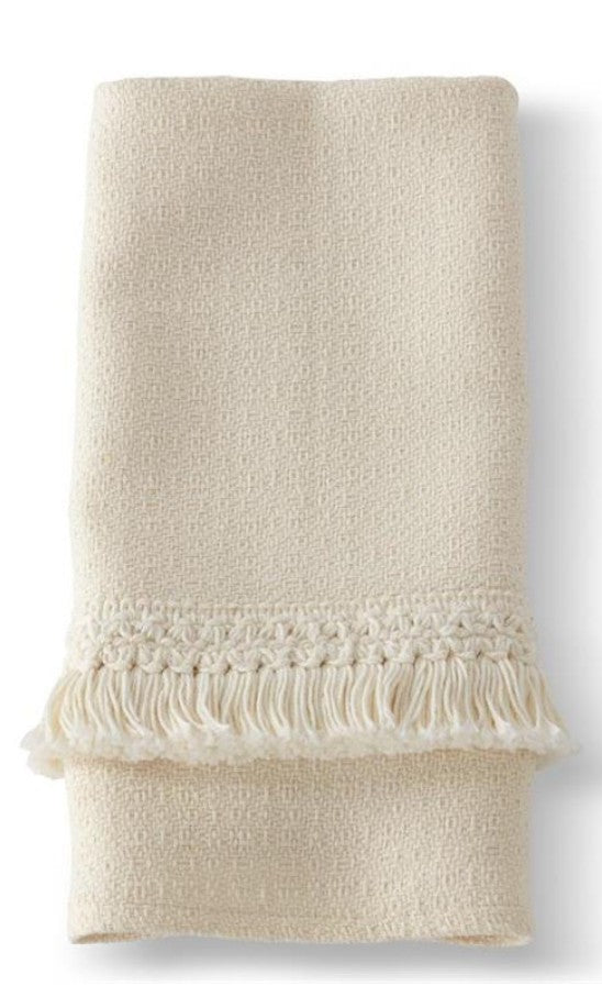• This white cotton towel with fringe brings quiet sophistication to any bathroom. Crafted from soft, absorbent cotton, it's designed to feel luxurious without demanding attention. The delicate fringe detail adds a refined touch that complements both modern and traditional décor. Perfect for everyday use or as a thoughtful gift for someone who appreciates the beauty of simplicity.
