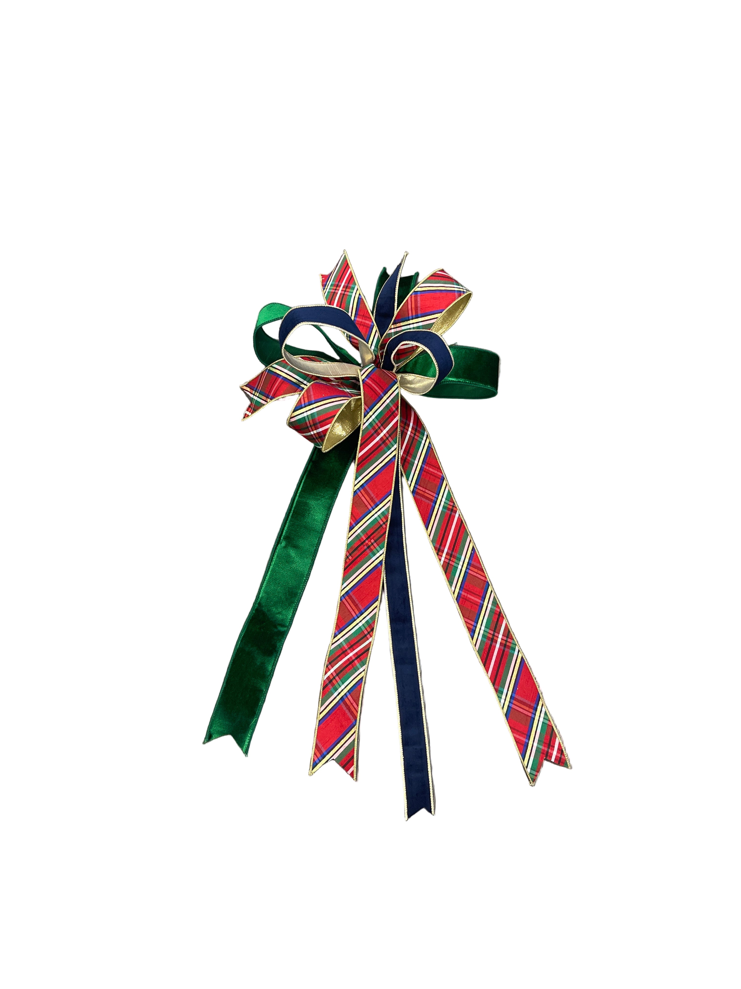 This traditional Christmas bow combines lush emerald green velvet with a faux dupion back in a 2.5" wired ribbon, paired with a 1" blue velvet ribbon edged in gold for a refined touch. The 2.5" faux dupion nutcracker plaid ribbon adds a festive, classic pattern, perfect for enhancing holiday wreaths, gifts, or décor. Crafted to hold its shape, this bow brings a warm and joyful spirit to your seasonal celebrations.