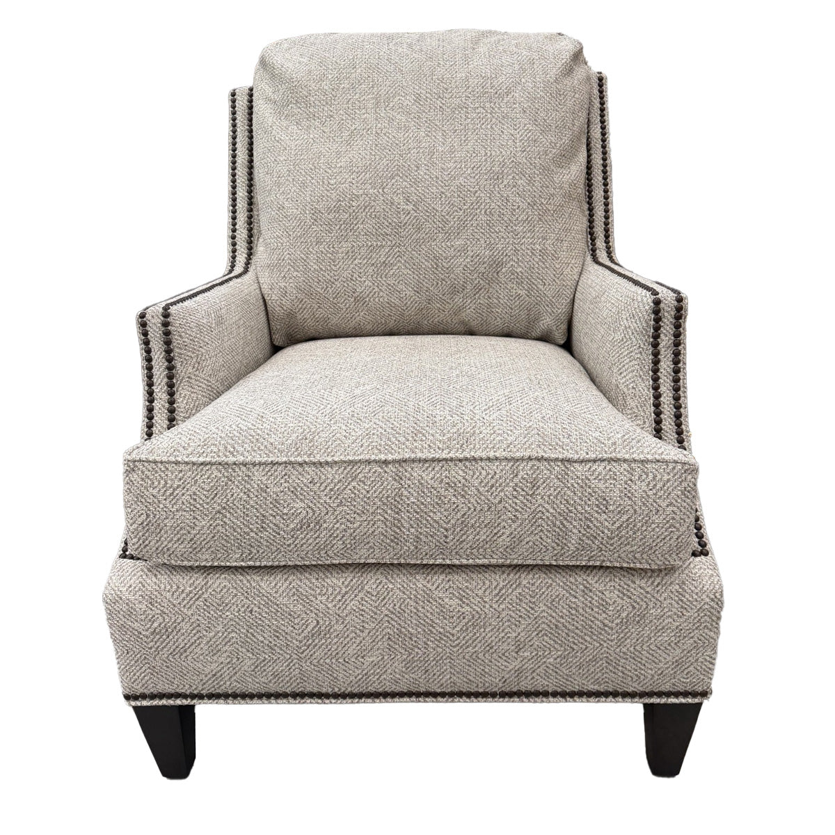 Crafted with beech solids and a beautifully tapered wood leg, the Savannah Lounge Chair offers both durability and elegant design. Its nailhead detailing adds a touch of sophistication to any room. Experience comfort and style with this expertly crafted piece. Available in stock as pictured or can be ordered with a fabric more suited to your taste.
