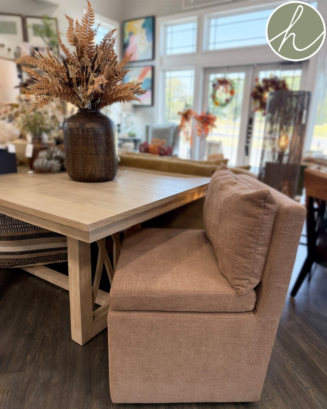 The Taylor Rust Dining Chair features a distinctive square shape with plush upholstered cushions and a unique pillow back design. This combination offers both style and comfort, making it an inviting choice for your dining space. Its supportive structure helps maintain good posture while adding a warm, personalized touch to your home.