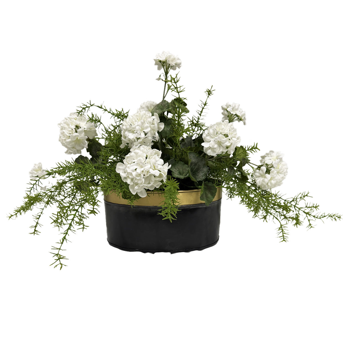 Add a touch of elegance to your home with our White Geranium Arrangement. This stunning piece features a large black and gold oval planter and vibrant asparagus fern, perfectly complemented by the delicate white geranium. Bring a touch of nature indoors with this beautiful arrangement.
