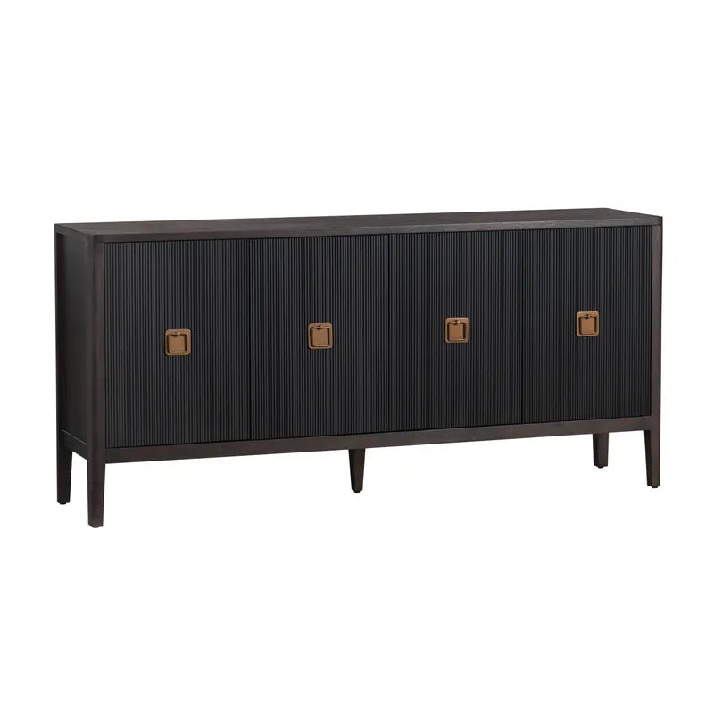 The Worthington Four-Door Sideboard brings contemporary elegance to any dining room or entryway. Crafted with black veneer and solid wood construction, this sleek piece features four spacious doors concealing two generous shelves—perfect for storing dinnerware, linens, or décor. Polished gold knob handles add a touch of refined sophistication. A modern silhouette with clean lines makes this sideboard an effortless addition to curated home spaces.