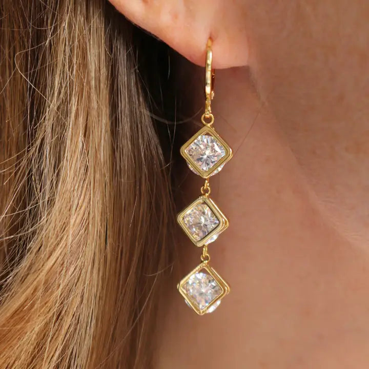 Radiate pure elegance with our Shine Bright Triple CZ Drop Earrings. Featuring three brilliant cushion-cut cubic zirconia stones set in polished gold frames, these earrings capture the perfect balance of glamour and grace. Lightweight with endless sparkle, they’re ideal for weddings, holiday events, or simply adding a touch of luxe to your everyday look.