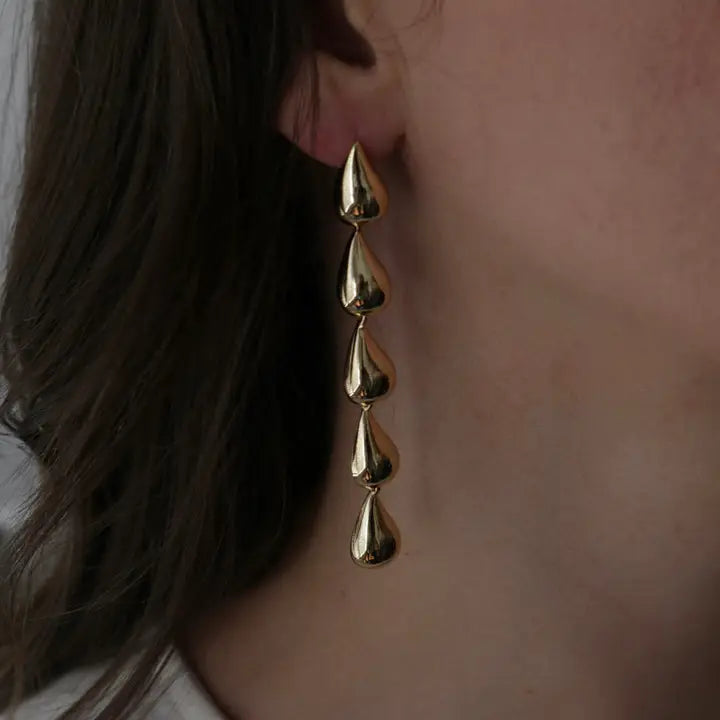 • Sleek, dramatic, and full of movement — the Raindrop Earrings feature a cascading row of glossy metal drops that catch the light with every step. Their elongated silhouette creates an instant statement while still feeling airy and wearable. Perfect for adding bold shine to an everyday look or dressing up for a night out, these earrings bring a modern, rock-and-roll edge to any outfit.