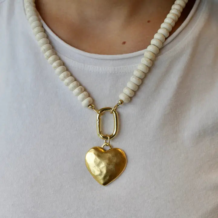 This beaded necklace features smooth, soft-toned beads paired with a gold-tone front clasp that doubles as a decorative carabiner-style closure, allowing you to add or remove charms with ease.
