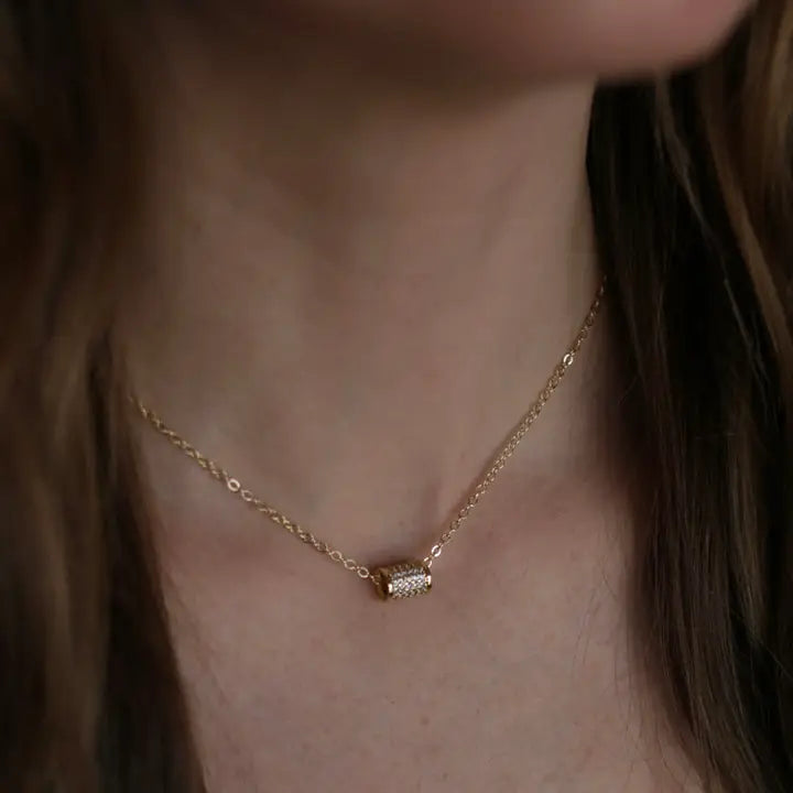 This dainty gold-filled chain makes a perfect addition to your necklace stack. The rhinestone tube adds the right amount of sparkle.
