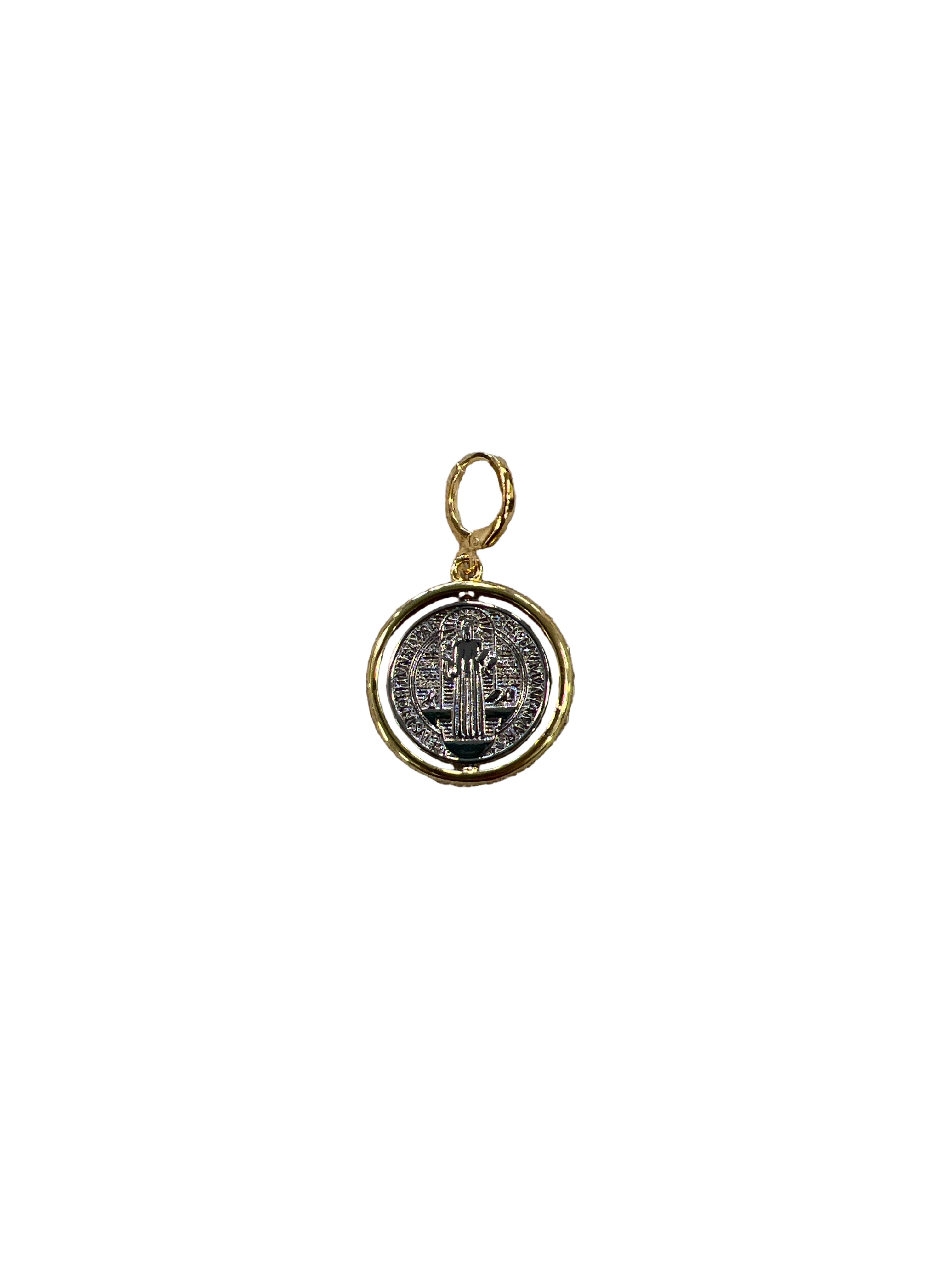 This Silver and Gold Round Saint Benedict Medal Scarf Charm is designed to elegantly transform your scarf into a statement necklace. Simply slip it onto your favorite scarf to add a touch of refined style and meaningful detail. Its versatile design allows you to wear scarves in new, creative ways while highlighting the charm’s classic gold finish. Perfect for elevating everyday outfits with subtle sophistication and personal expression.