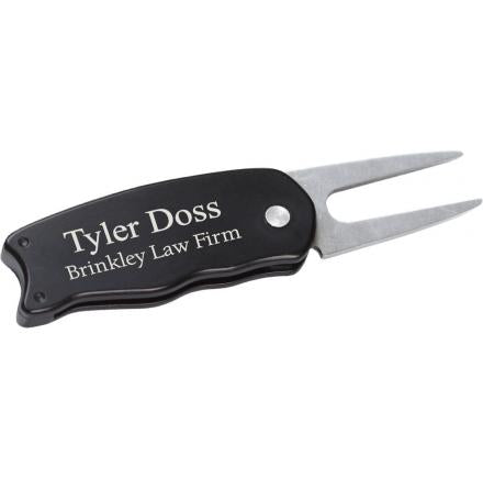 • Sleek and functional, this personalized divot tool is the perfect golfing companion. Easily carry in a pocket of golf bag. Spring-loaded prongs snap into action for fixing course damages and fold up for storage. Features a magnetic, removable ball marker on side. Personalize tool with your name, initials or business.