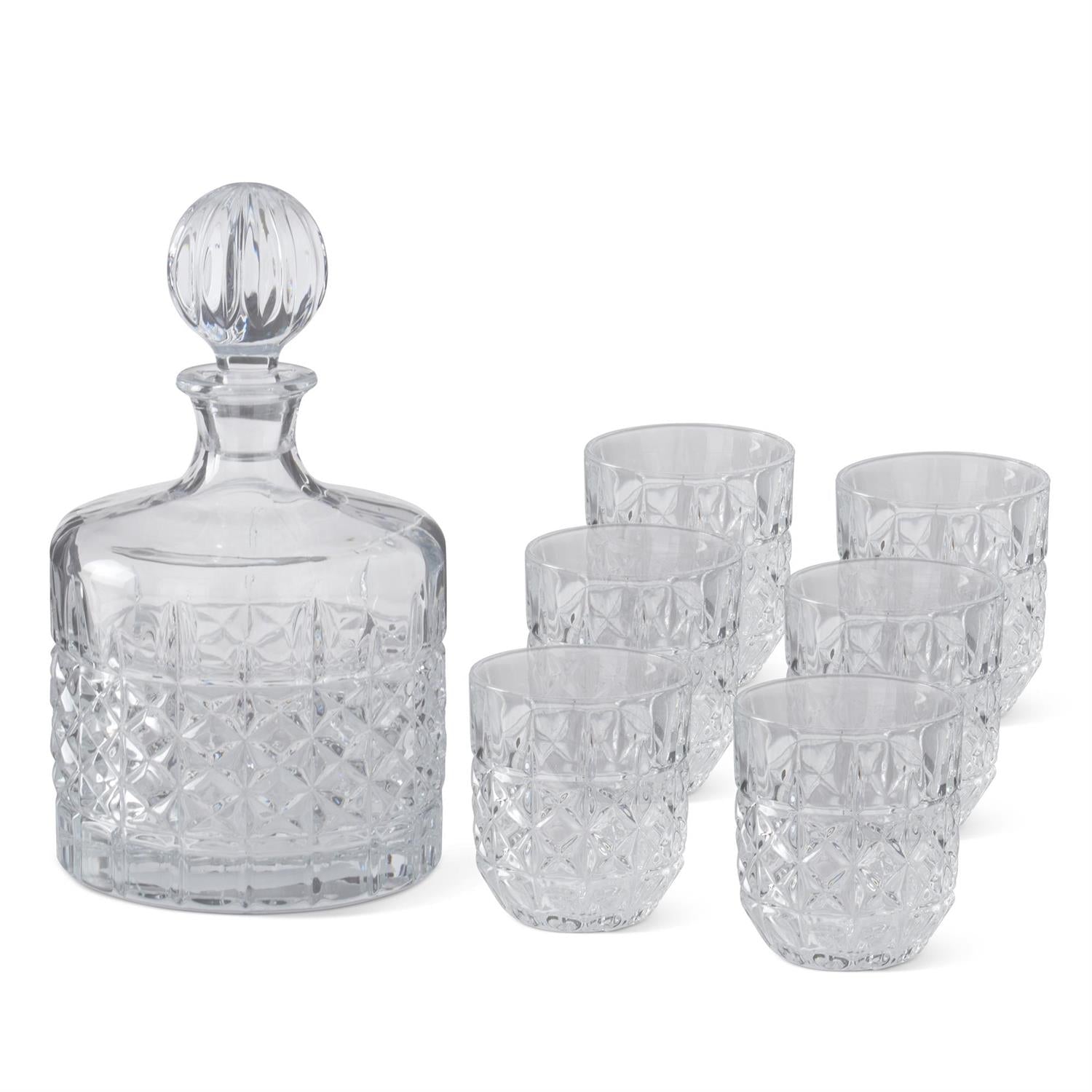 Elevate your home bar with our Pressed Glass Decanter & Lowball Drinking Glasses Set! The stylish design adds a touch of sophistication to any drinkware collection. Impress your guests with this set of 7, perfect for entertaining or for everyday use. Cheers to a well-stocked and stylish bar!