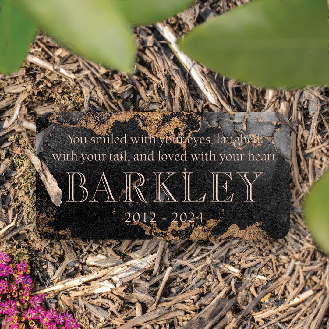 • These stones are crafted from weather resistant, faux marble - adding beauty and design to outdoor spaces. Featuring a personalized sentiment, they are great for welcoming guests, decorating a garden, and honoring a loved one or pet. Weighted design easily nests in soil, mulch, or grass.
