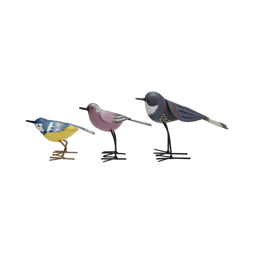 Hand-painted metal birds bring artisanal charm to any space. This assorted set features three distinctive styles—blue and yellow, subtle pink, and dark blue with red—each piece individually crafted with care. Perfect for garden displays, shelf styling, or as thoughtful gifts, these decorative birds add warmth and character to your home. Durable metal construction ensures lasting beauty season after season. Due to the handmade nature, each piece will be unique.