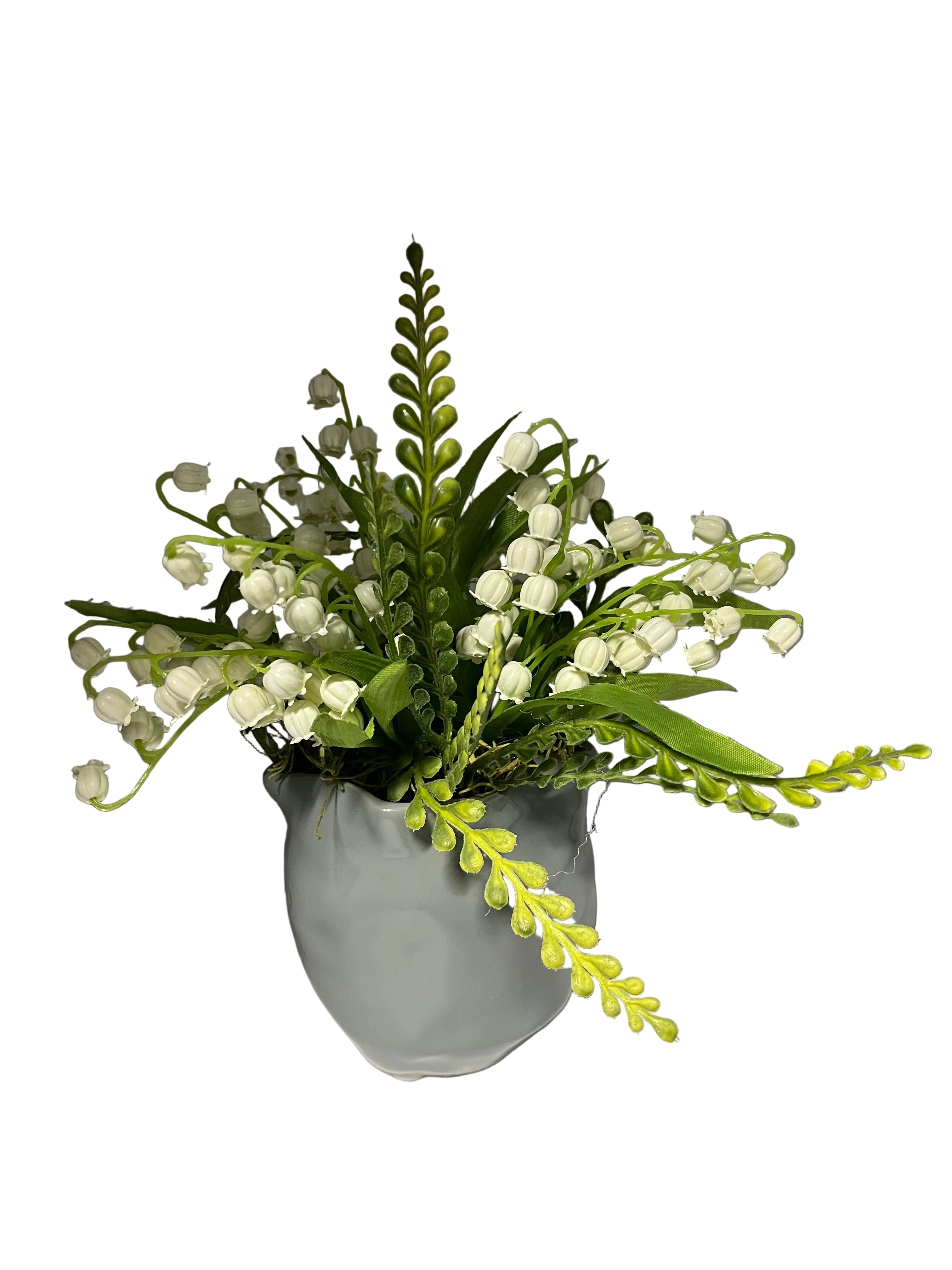Bring a touch of natural elegance to any room with this charming lily of the valley arrangement nestled in a soft gray ceramic vase. The delicate white blooms and lush green foliage create a fresh, garden-inspired aesthetic that brightens your space with subtle fragrance. Perfect for desks, nightstands, or shelving, this petite arrangement adds understated sophistication while helping freshen the air around you. A timeless accent piece that celebrates the beauty of nature's simplest pleasures.
