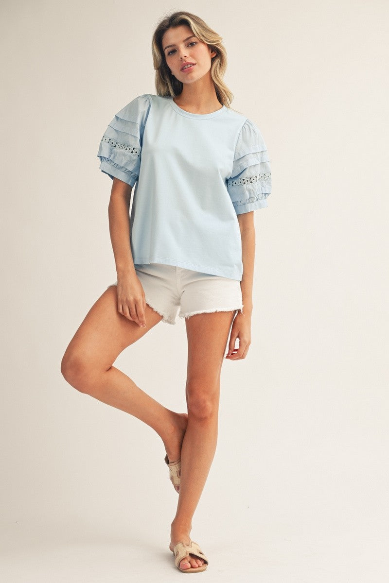 Elevate your everyday wardrobe with this charming solid top, designed to bring effortless elegance to any occasion. The delicate lace accents frame the shoulders beautifully, while the short puff sleeves add a touch of romantic flair and dimension.