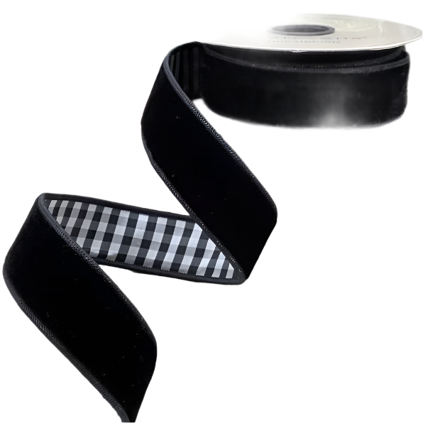 Black Velvet Taffeta Ribbon with Check Back - SOLD BY THE FOOT