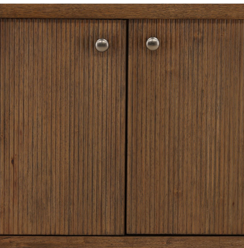 The Estrada Sideboard is crafted with rubber wood and oak veneer for long-lasting durability. Featuring a shelf underneath and four doors with a ribbed textured front, it offers ample storage space. The dark brown finish and antique gold knobs elevate any room's aesthetic.