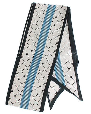 Elevate your everyday style with this versatile narrow scarf, featuring a sophisticated blend of dotted and stripe patterns in calming blue and ivory tones. Measuring 5" x 59", its slender silhouette makes it perfect for draping, tying, or accessorizing any outfit. The light and medium blue stripes down the center add visual interest while maintaining an effortlessly chic aesthetic.