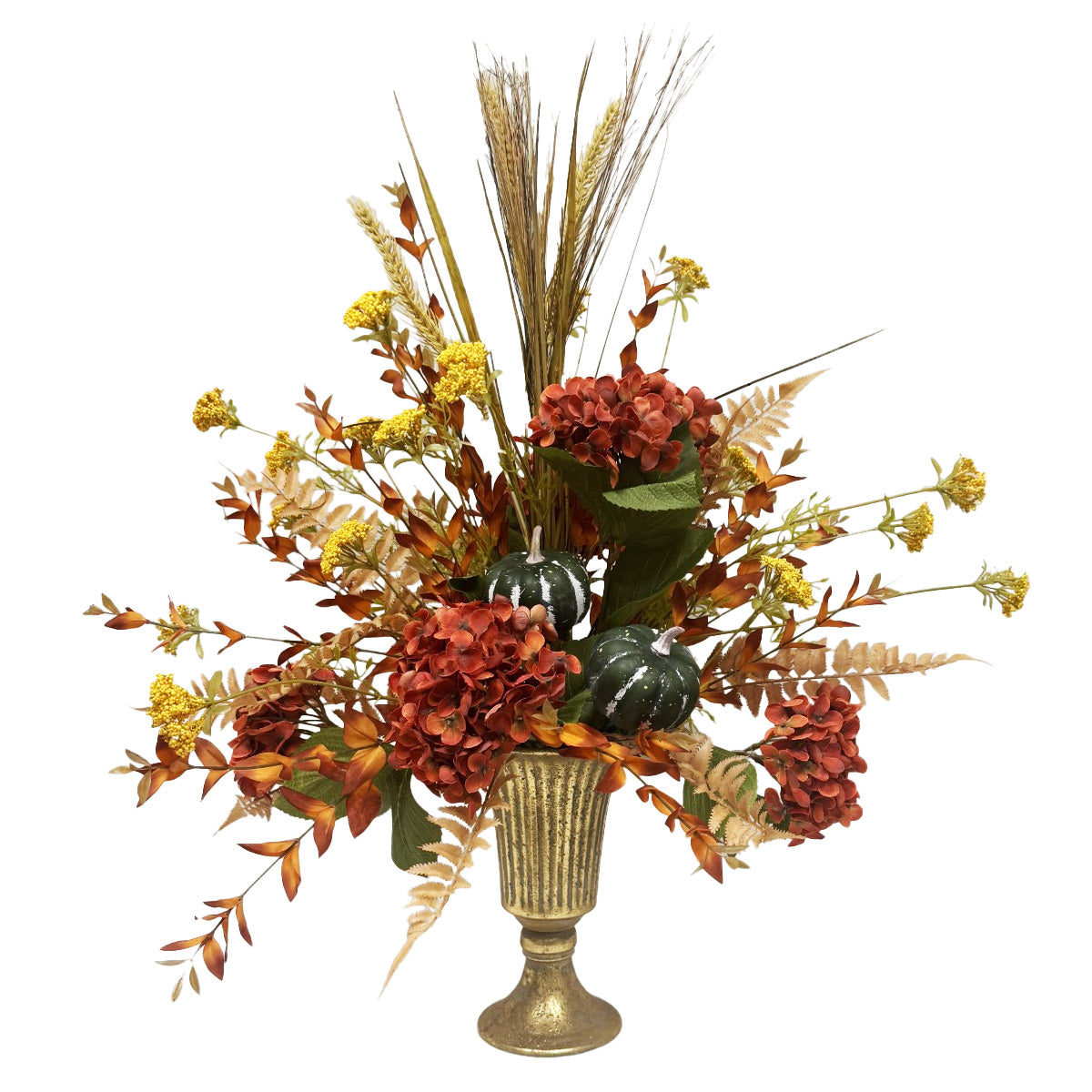 Bring warmth and natural charm to any space with this Rust Hydrangea & Yarrow in Brass Vase Arrangement. Featuring rich rust hydrangea, delicate rust myrtle, cream wheat and grass, speckled orange and brown fern, golden wild yarrow, and vibrant green pumpkins, this carefully crafted display evokes the beauty of autumn. The elegant brass vase adds a touch of timeless sophistication, making it perfect for brightening your home or office with a cozy, seasonal touch.