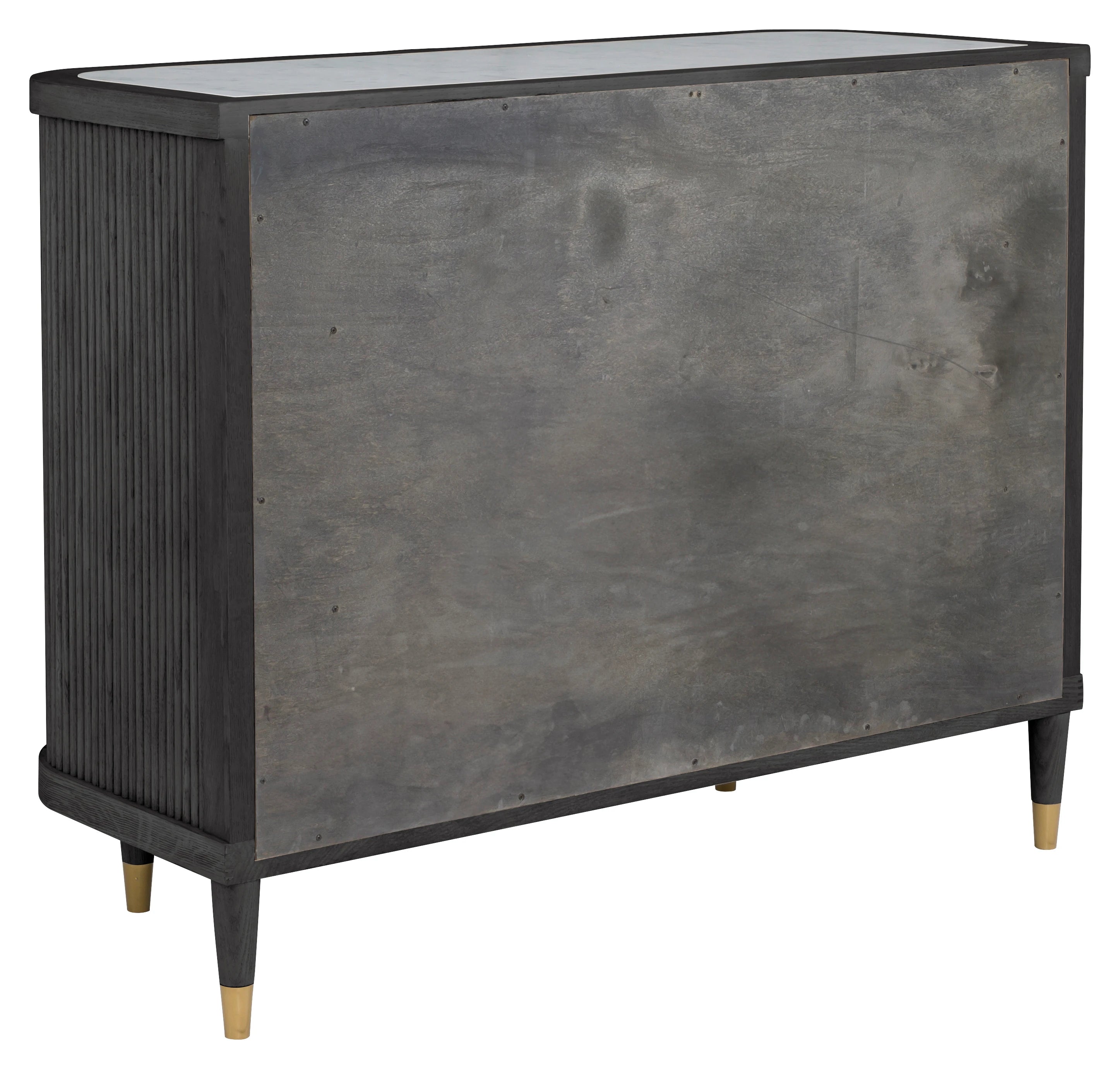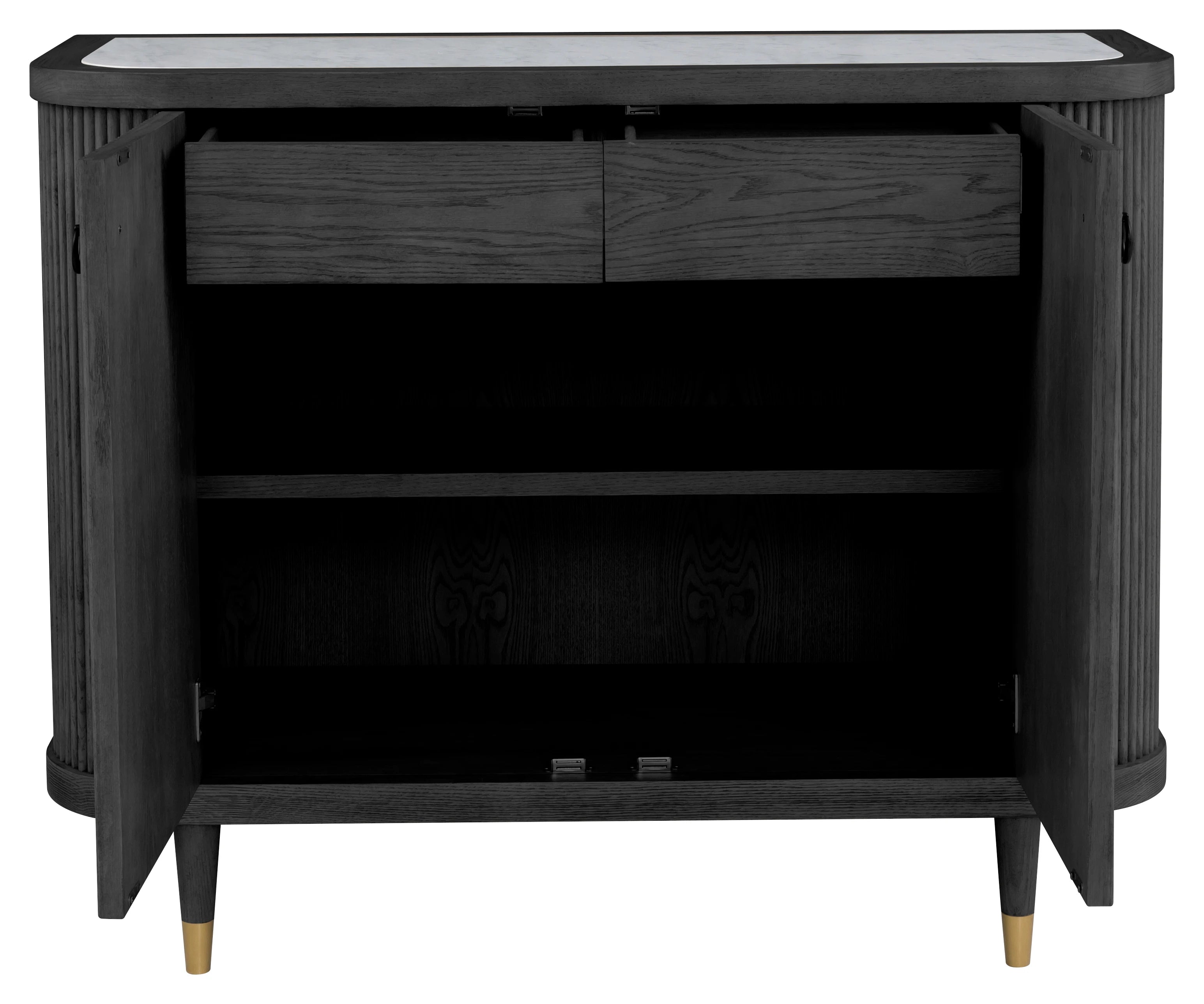 • The Everett Demilune Credenza brings refined elegance to any room with its curved silhouette and thoughtful construction. Crafted from red oak solids and veneers, this two-door piece features tambour panels that add visual interest and authentic craftsmanship. Inside, discover two spacious drawers and an adjustable shelf for flexible storage solutions. The inset white Carrara stone top provides a sophisticated surface, while brushed brass hardware and ferrules deliver a warm, polished finish that complements the charcoal frame beautifully.