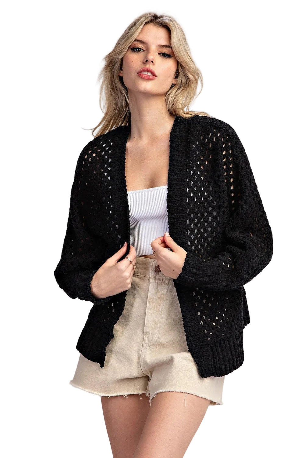 Solid long sleeve crochet knit cardigan featuring a ribbed open front, ribbed cuffs, a ribbed bottom band and is a relaxed fit.