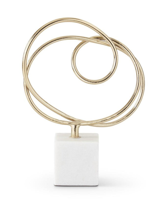 An elegant statement piece that brings contemporary sophistication to any room. This sculptural form features refined gold-toned metalwork set against a pristine white marble base, creating striking visual contrast. The abstract design invites interpretation while maintaining a polished, gallery-quality aesthetic. Perfect for modern interiors, minimalist spaces, or as a curated accent on shelving and surfaces. A versatile addition that elevates your home's design narrative with understated luxury.