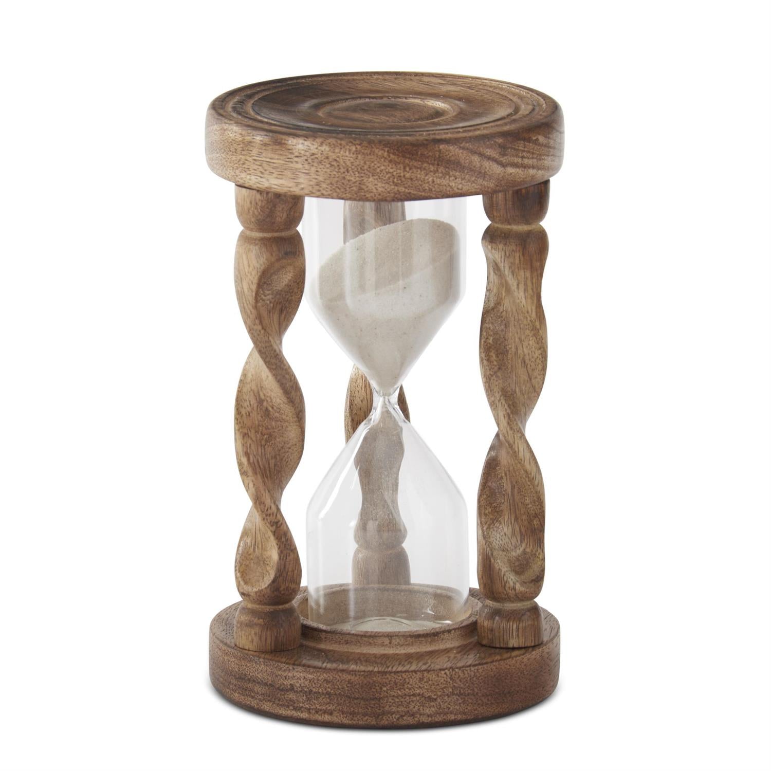 Timeless elegance meets functional art with this striking spiral wood and glass hourglass. Crafted with natural wood detailing and clear glass chambers, it captures the passage of time in mesmerizing style. Perfect for desks, shelves, or as a thoughtful gift, this piece brings a touch of sophistication to any room. Dimensions: 7H x 4W x 4D inches.