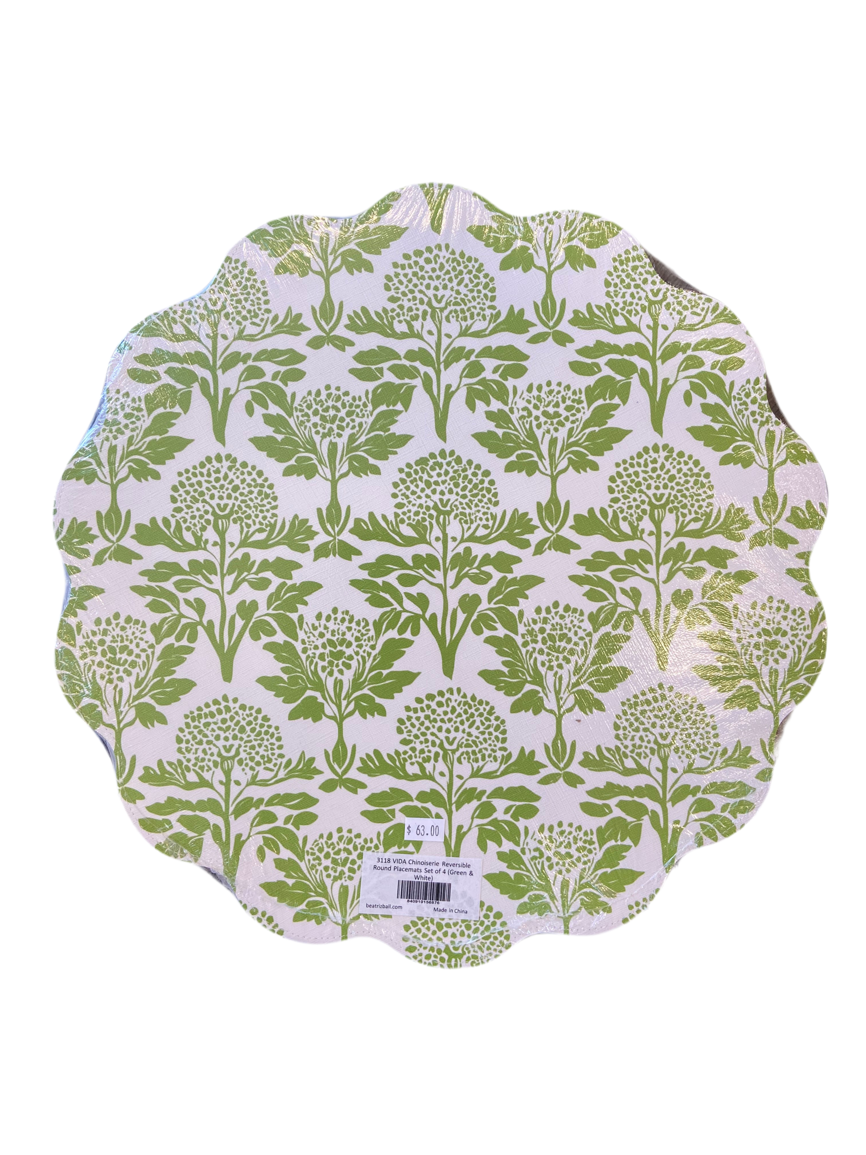 • Two sides to every story ... The VIDA Chinoiserie Reversible Round Placemats Set of 4 (Green & White) is like two placemats in one. The reversible placemats with a leatherlike feel and linen texture are printed with one side featuring a classic Chinoiserie branch design, the reverse offering a stylized floral pattern in shades of teal. Sold in sets of four, the placemats will give any table an instant makeover with their lively colors and graphics. A chic, high-end look with the durability and carefree quality you'll love. Generously sized for a handsome look on your table. Easy care, wash with soap and water. Made exclusively for Beatriz Ball.