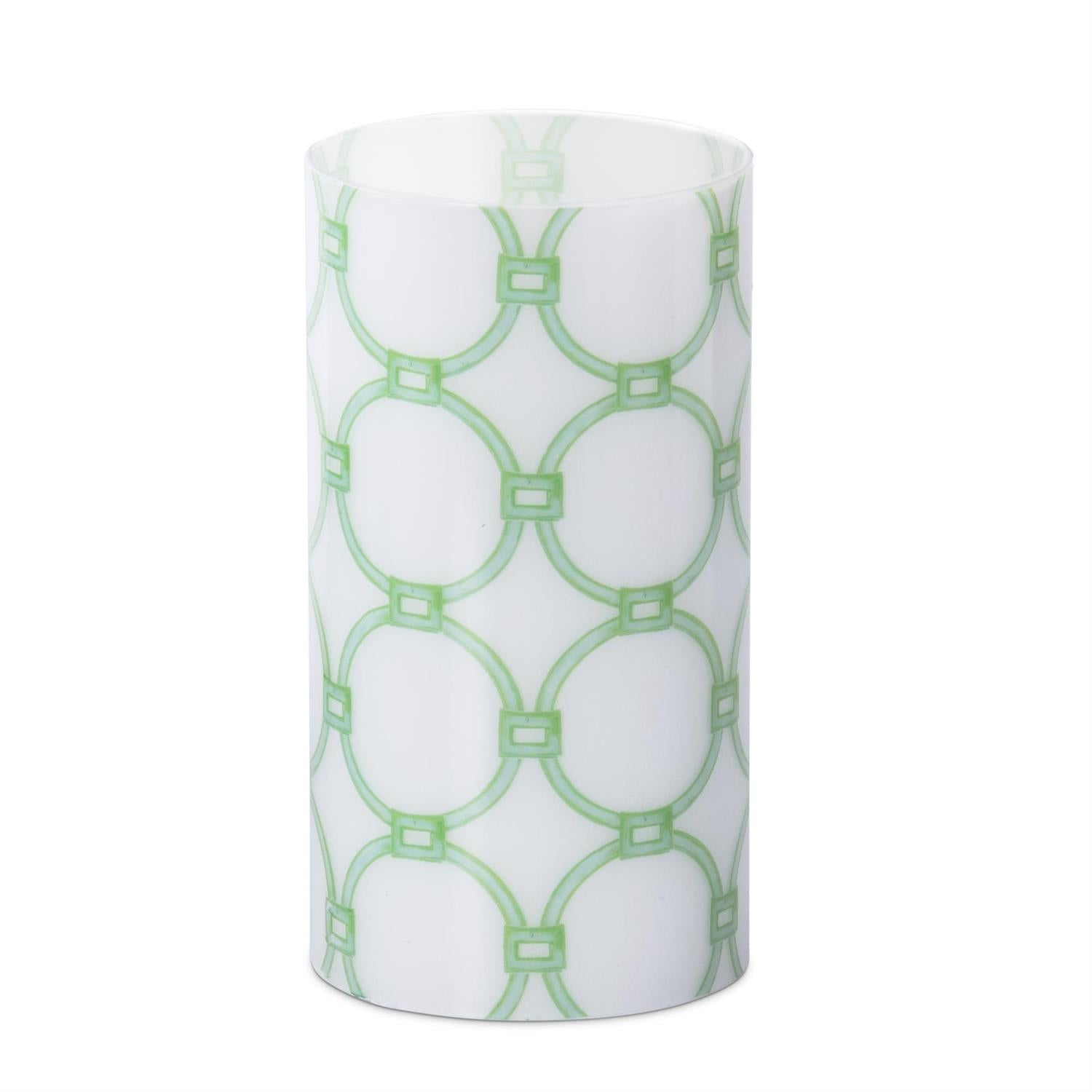 This 7.75" Green & White Link Glass Candle Slip Cover is designed to fit perfectly over our LED pillar wax candle or LED water pillar wax candle, sold separately. It adds a charming touch while protecting your candle and enhancing its glow. Ideal for creating a cozy, decorative ambiance in any room.