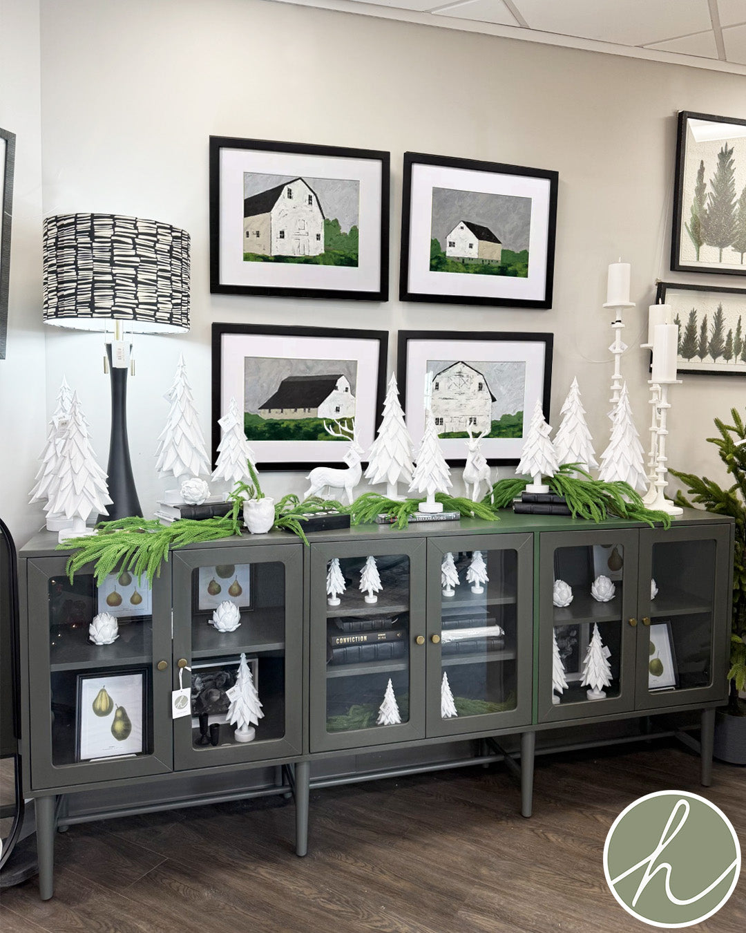 Nostalgic farm structures contrast with a green landscape. Invite the country into your home with these charming prints of crisp clean white barns; matted in white and framed in a flat profile molding in a dark espresso wood finish.