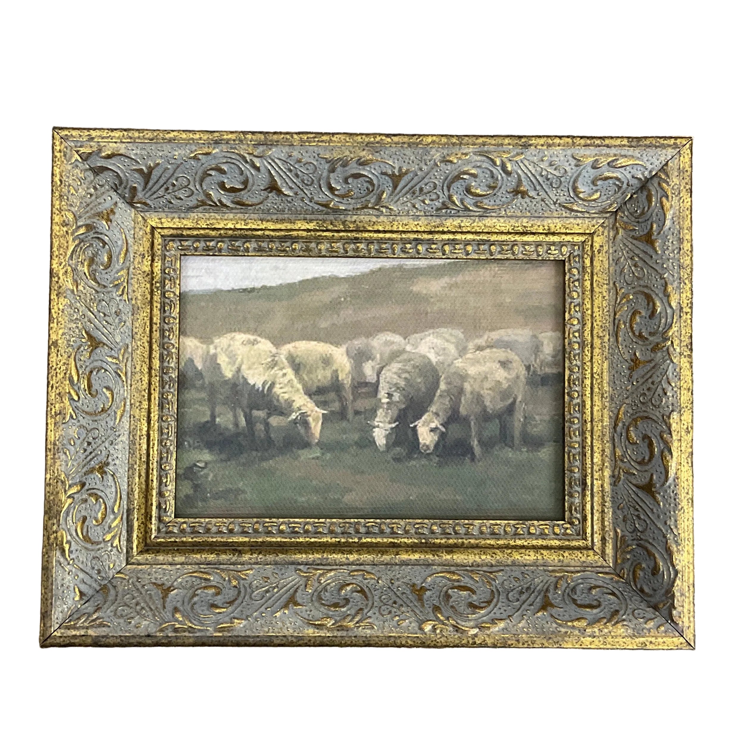 Bring timeless pastoral charm into your home with this beautifully framed antique sheep landscape. The classic 7"x5" dimensions make it perfect for shelves, desks, or gallery walls without overwhelming your space. Featuring warm, muted tones and intricate detail work characteristic of vintage countryside art, this piece adds a touch of rustic elegance to any room.