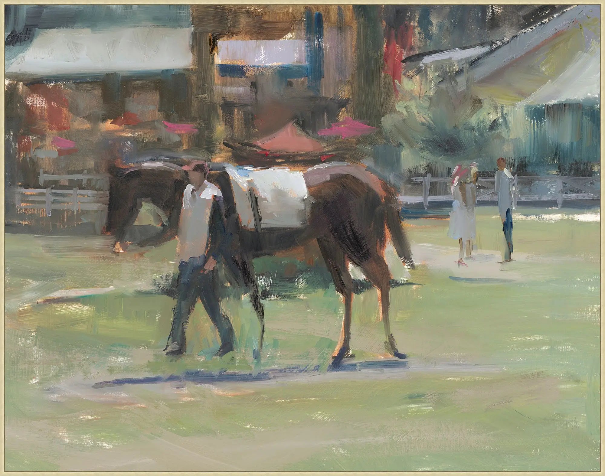 • The Downs Framed Canvas features a beautiful giclee print on high-quality canvas, professionally gallery wrapped for a polished look. Artist enhanced details bring depth and life to the scene of a horse being gently led at a serene horse farm. This piece adds a warm, tranquil touch to any space, perfect for horse lovers seeking a meaningful and enduring work of art.