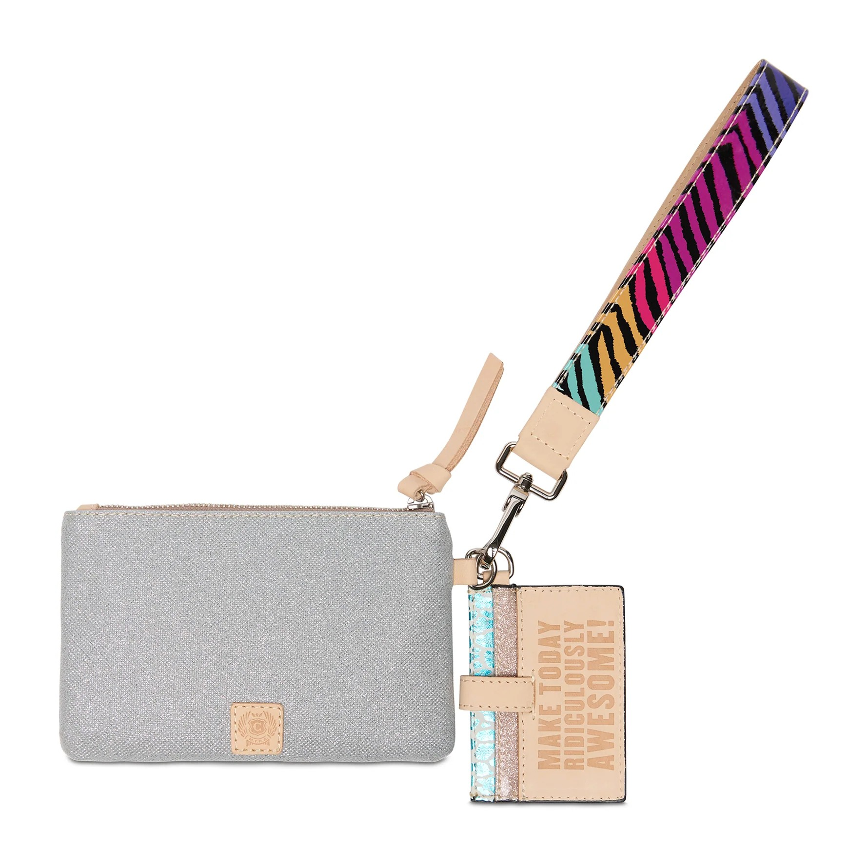 • The Combi, a combination of on-the-go accessories, is a new way to carry your keys, cards, and the small stuff together or separately. This embroidered wristlet wallet includes a pocket pouch, secure card slot wallet and fits comfortably around your wrist.