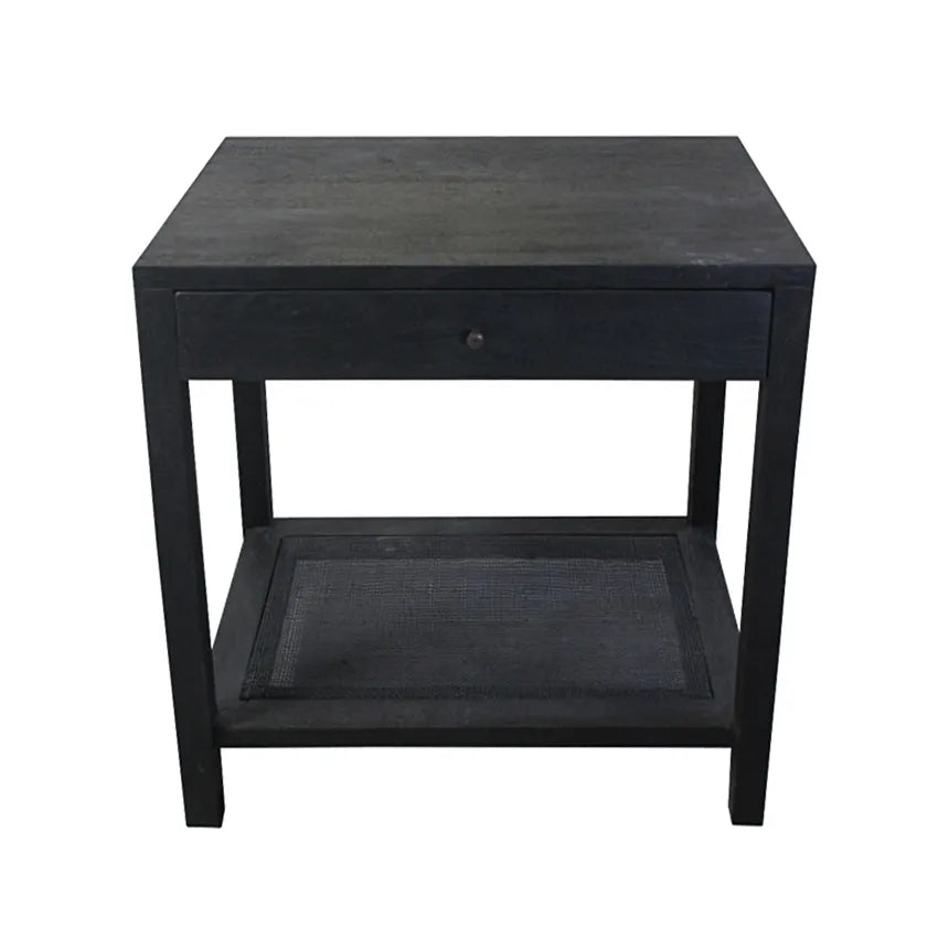 • Let your inner interior designer shine with the Barbados Black Cane End Table. This modern-rustic piece is made from natural mango wood in classic, four-post design. Naturally finished with a clear varnish topcoat, the table includes a sliding drawer with antique black hardware for storing electronics or small articles. Adding to the functionality of this design is a single shelf that boasts a stretched panel of natural cane/rattan in a mesmerizing, open weave pattern. The pattern allows light and air to flow through, creating a sense of openness that is sure to invite serenity.