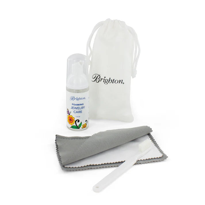 • This gentle, biodegradable jewelry cleaner is safe for Brighton’s silver-plated and gemstone jewelry, and specially formulated to keep it looking its best. Kits includes a polishing cloth, brush, and pouch