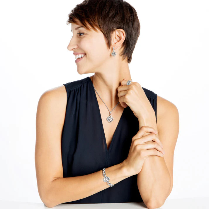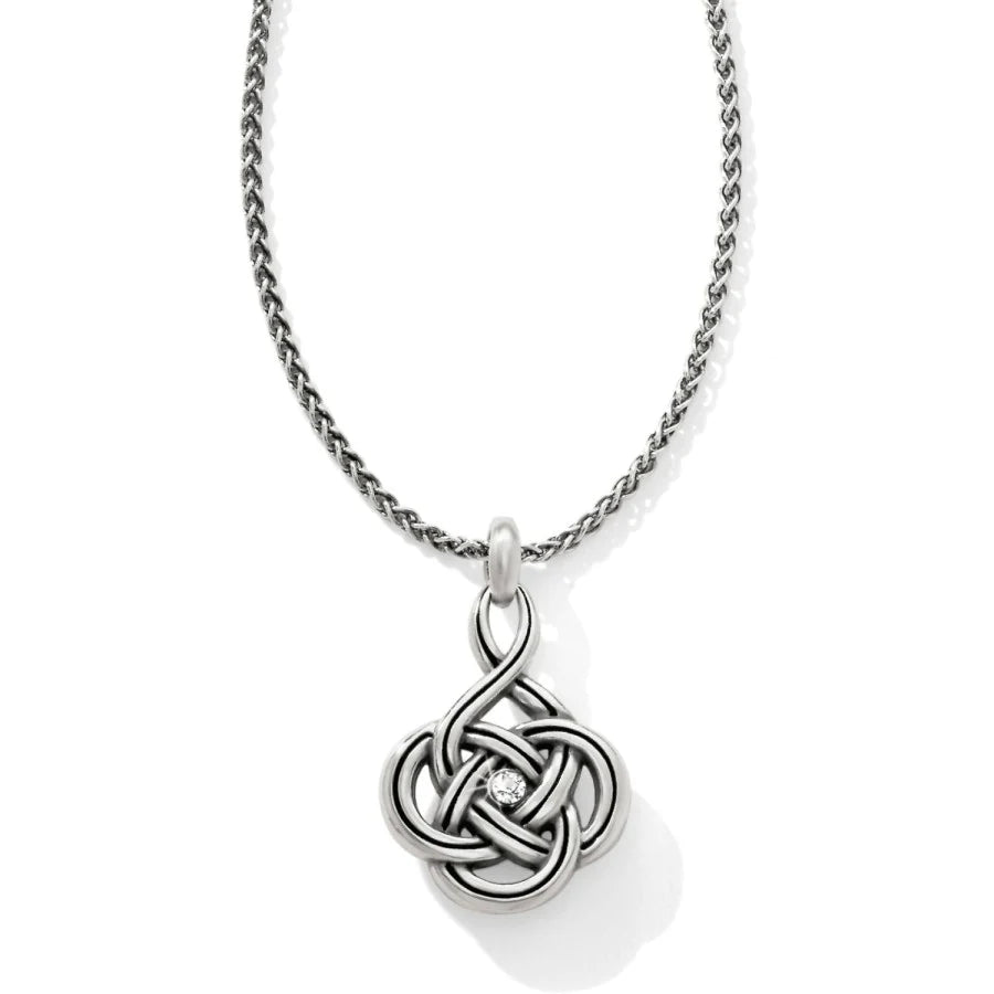 Recalling Celtic motifs, the interlocking knot on this silver necklace signifies love and life. Classic and everyday wearable.