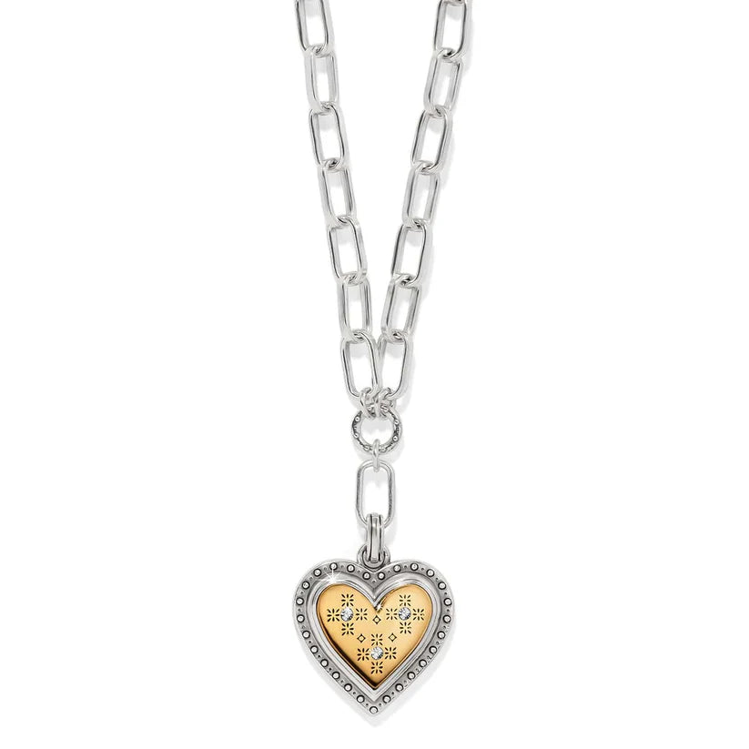 This jewelry that our designer Beth Ferrara created is etched in southwest symbolism and inspired by Mexican Talavera tiles – which are handmade ceramics with designs that have a one-of-a-kind feel. A larger size heart pendant with an etched brushed gold inlay and 3 silver shade crystals. The chain is one not seen before, a large “paperclip” style (trendy!) Back reads, Love is the sunshine of the heart.
