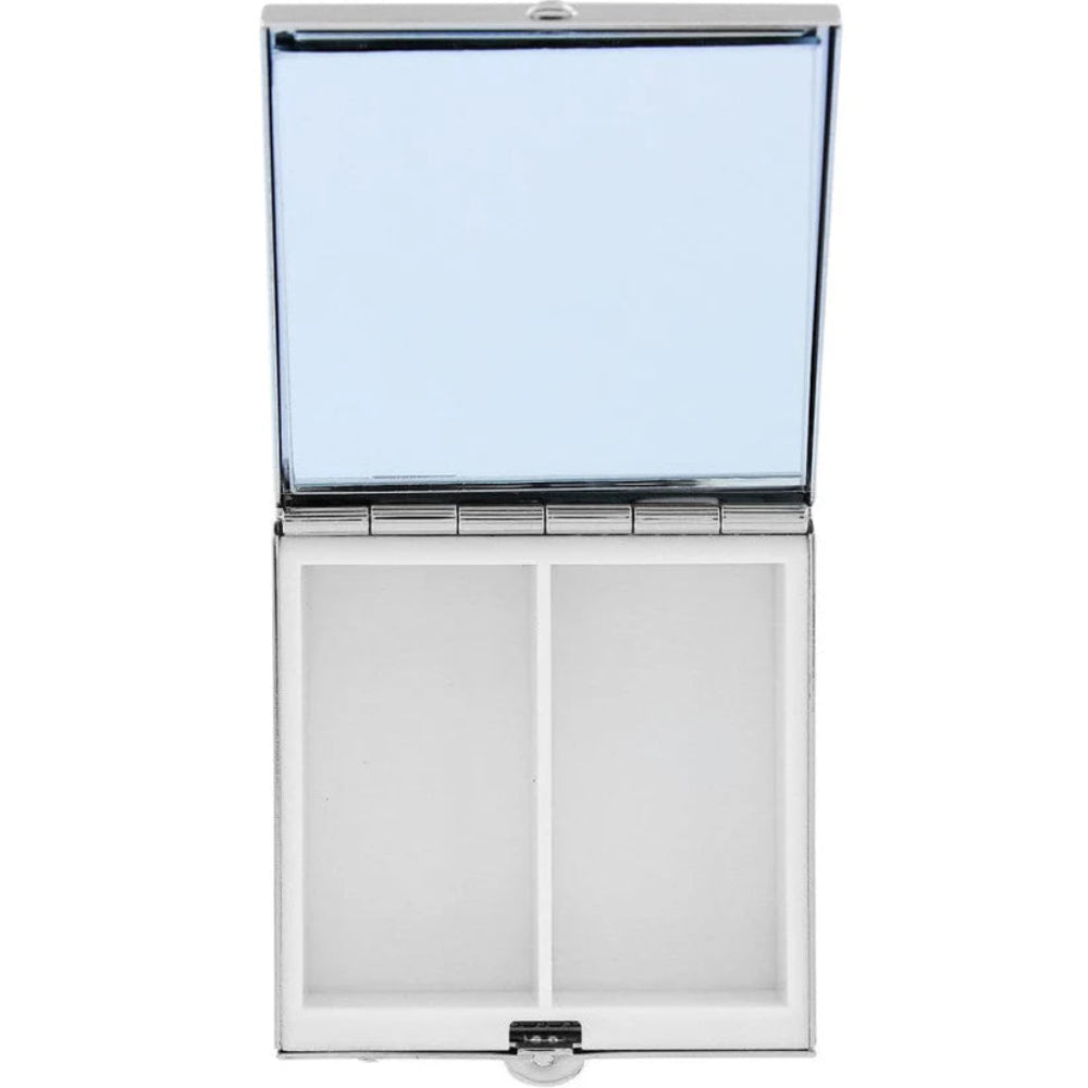 This silvery etched pill box with opalescent insert is breathtakingly beautiful. Features an interior mirror and pressure release opening for ease and convenience!