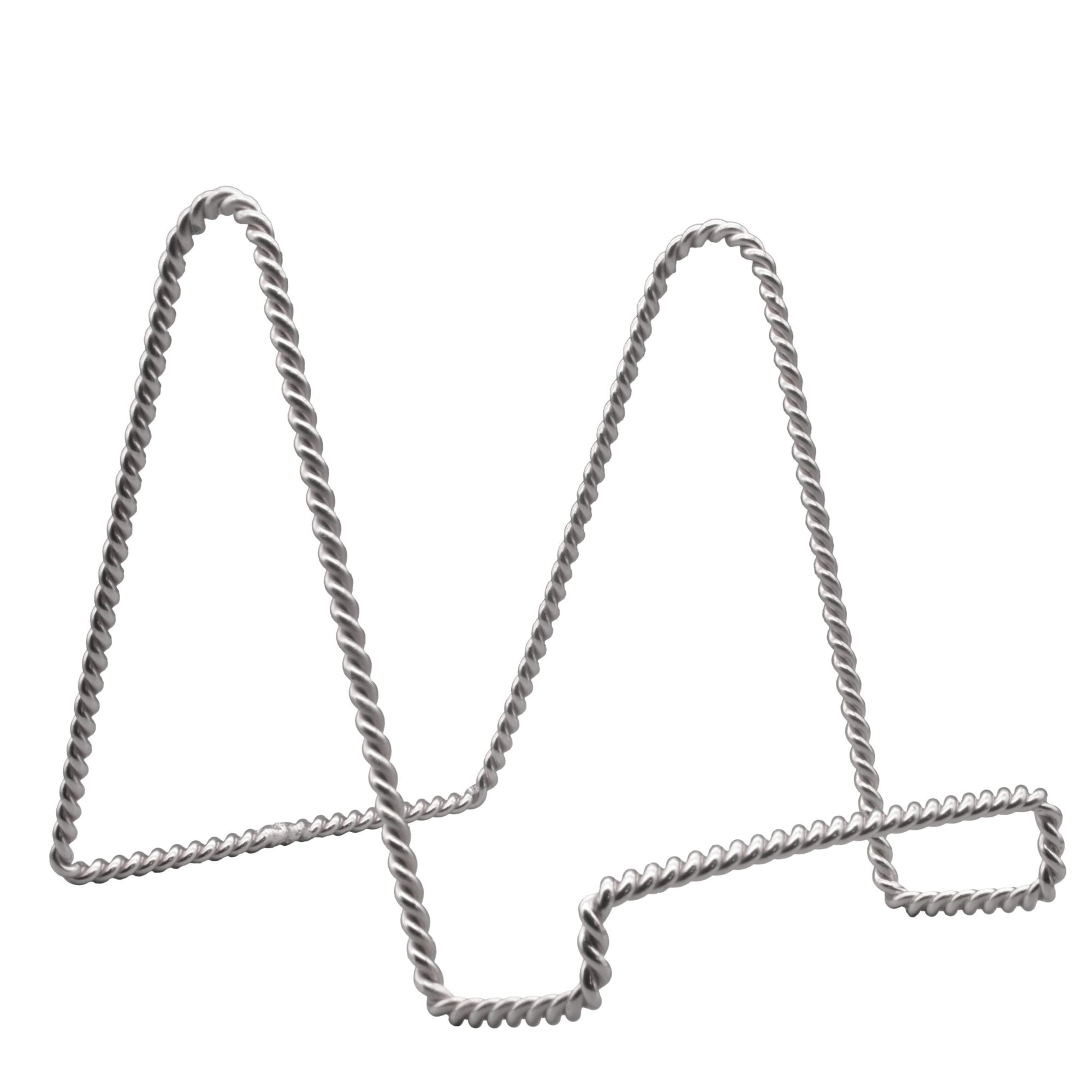 A silver chrome wire easel stand for displaying anything from a canvas to a decorative plate.