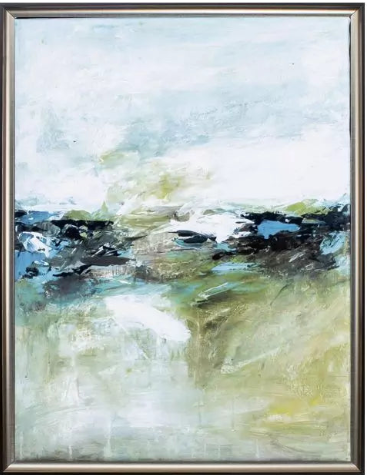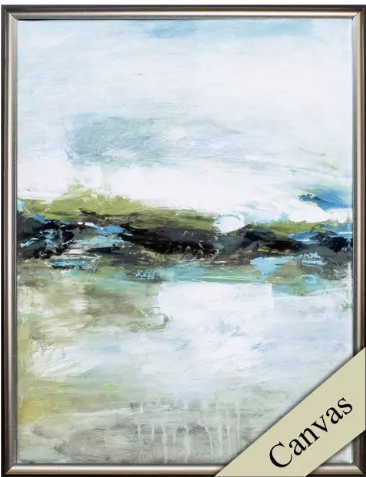 Modern abstracts in blue and green on wrapped canvas. Each is finished with a contemporary silver frame.