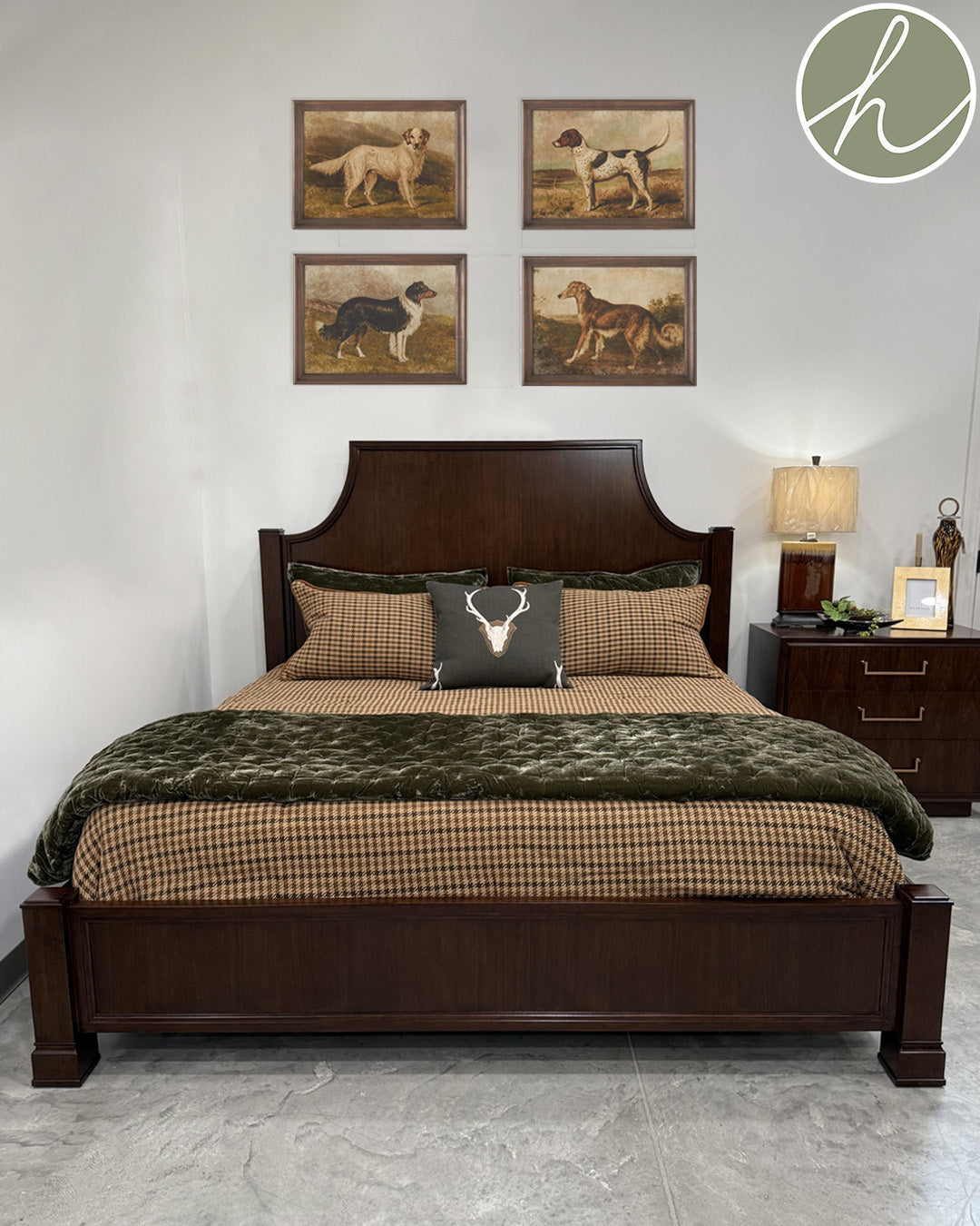 The Essex poster bed features tall headboard posts with a rose gold finish on the finials. The posts are removable, offering a low-post option, finished with a decorative cap. The headboard features a draped arch design with quartered walnut veneer on the panel.
