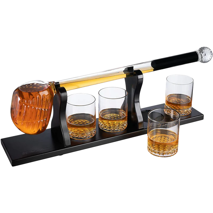 Store spirits with sophisticated style as you celebrate the love of golf. Golf whiskey decanter sets include one glass decanter, four liquor glasses, and a mahogany wood base for impressive display that is both elegant and functional.