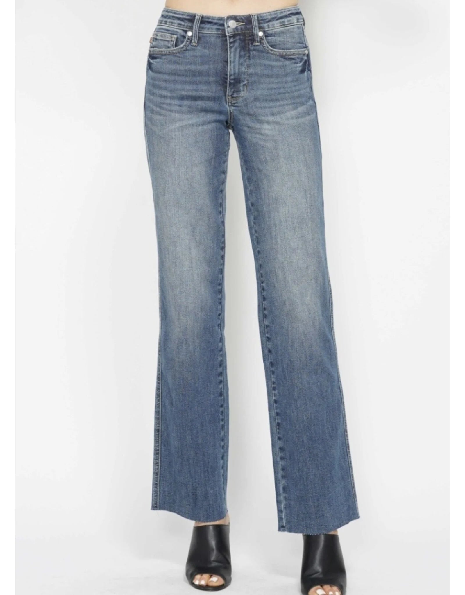 It’s the Judy Blue Mid-Rise Tummy Control Vintage Straight Jeans. Crafted from a soft, incredibly stretchy blend of 91% Cotton, 7% Polyester, and 2% Spandex, these medium wash jeans offer ultimate comfort and a timeless look. Featuring a mid-rise front (10″) and a straight leg with a 32″ inseam, they include tummy control for a flattering fit. Perfect for any occasion, these jeans blend vintage style with modern comfort.