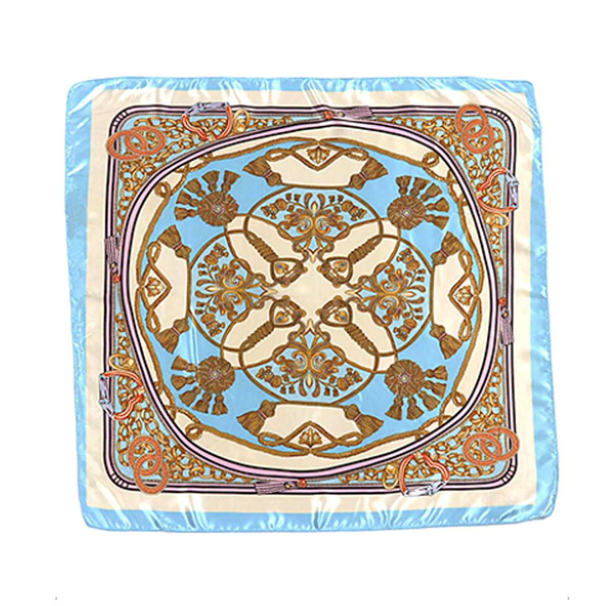 This 34" square silky bandana features a charming braid design on a calming light blue background, accented with cream, beige, and burnt orange tones. Designed with a chain, tassel and zipper design, it offers a unique twist to a classic accessory. Soft and smooth to the touch, it’s perfect for adding both style and comfort to your everyday look.