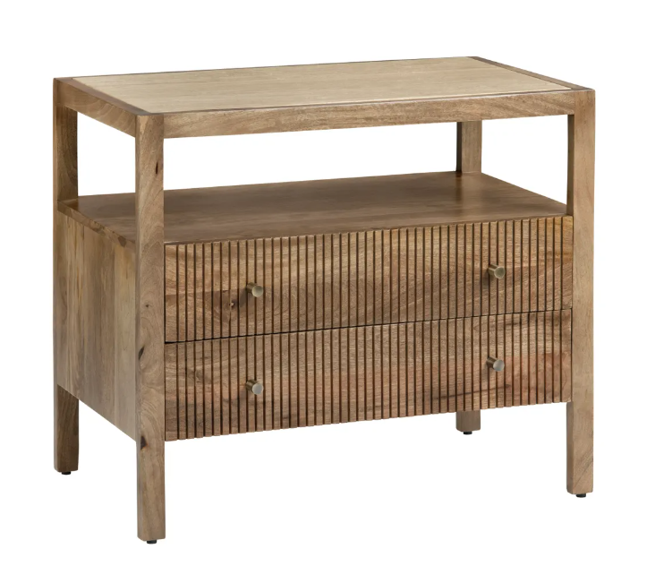 • The Mason Bedside Table is the perfect addition to any bedroom. Its rich brown stain and ribbed front design add a touch of elegance, while the open design and cream stone look top offer functionality and style. With two spacious drawers, you'll have plenty of storage for all your bedside essentials.