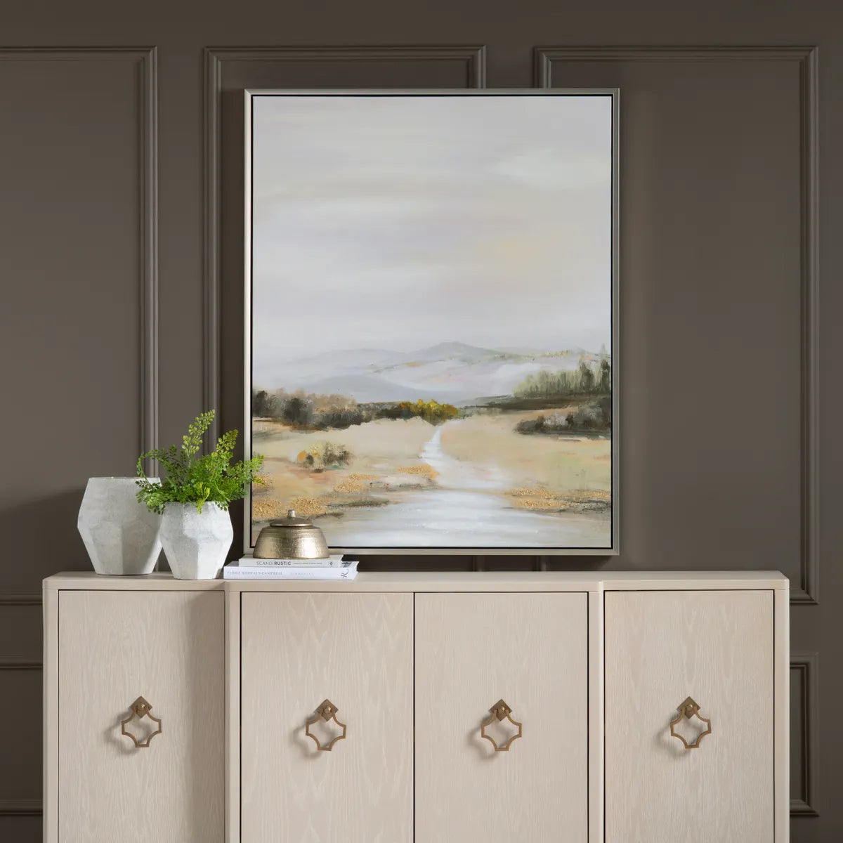 Introducing Medford Canvas Painting, a landscape scene that invites you to embark on a visual journey into the heart of nature. This canvas beautifully portrays a pathway up close, leading your gaze to the distant trees and rolling hills. The warm color palette evokes a sense of comfort and harmony, while hand-painted textures and delicate gold foil embellishments add depth and intrigue to the artwork. Framed in elegant champagne, this piece becomes a statement of timeless sophistication and a stunning focal point in any space.