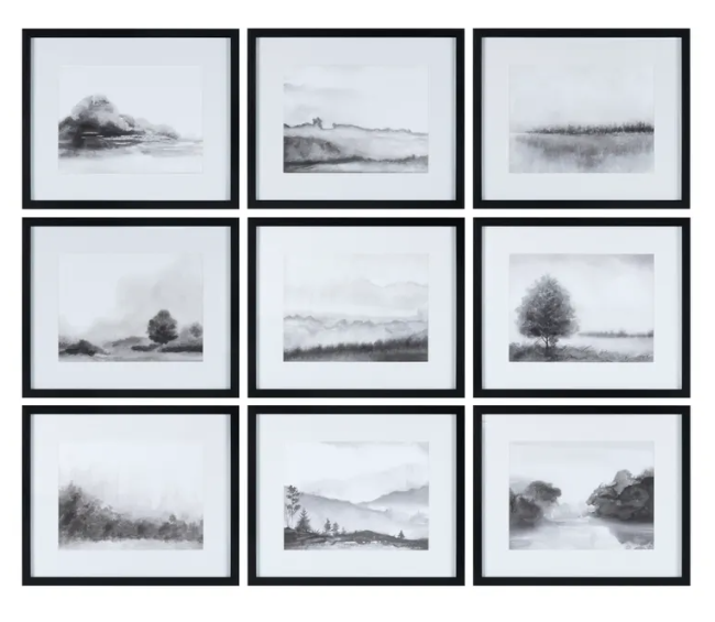 Elevate your space with the captivating Pritchard Framed Wall Decor Prints, a stunning collection that effortlessly combines the timeless allure of black and white with the natural beauty of landscapes. Each print showcases a unique landscape scene, skillfully rendered in a charcoal aesthetic that exudes a sense of calm and depth. From rugged mountains to serene lakeshores, each image transports you to a different corner of the world. The black and white color scheme, with its striking contrast, adds a touch of drama to your decor while maintaining a classic and versatile appeal. To complete the look, these prints are housed in sleek black frames that not only protect the artwork but also add a modern edge to the collection. Use alone or in a set for a statement wall.*Price reflects the cost of ONE piece of artwork.Please choose preferred style by position (left, center, or right and top, middle, or bottom). We will do our best to accommodate your preference. Limited quantities available.