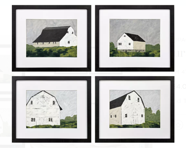 • Nostalgic farm structures contrast with a green landscape. Invite the country into your home with these charming prints of crisp clean white barns; matted in white and framed in a flat profile molding in a dark espresso wood finish.