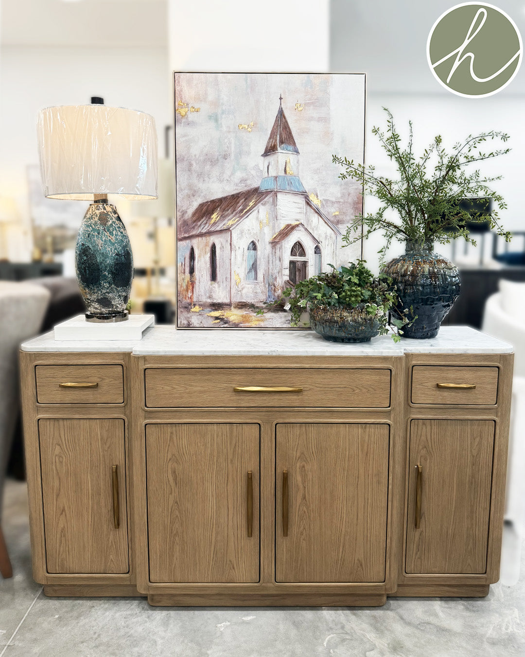The breakfront is a benchmark of traditional styling dating to the 17th Century. Simpatico renders the silhouette in clean, softened lines, letting the silking wire brushed white oak do the talking while a Carrera marble top and a unique, faceted take on typically austere bar pulls complete the transformation. Two adjustable shelves are in each compartment, and the back is ported for media use.