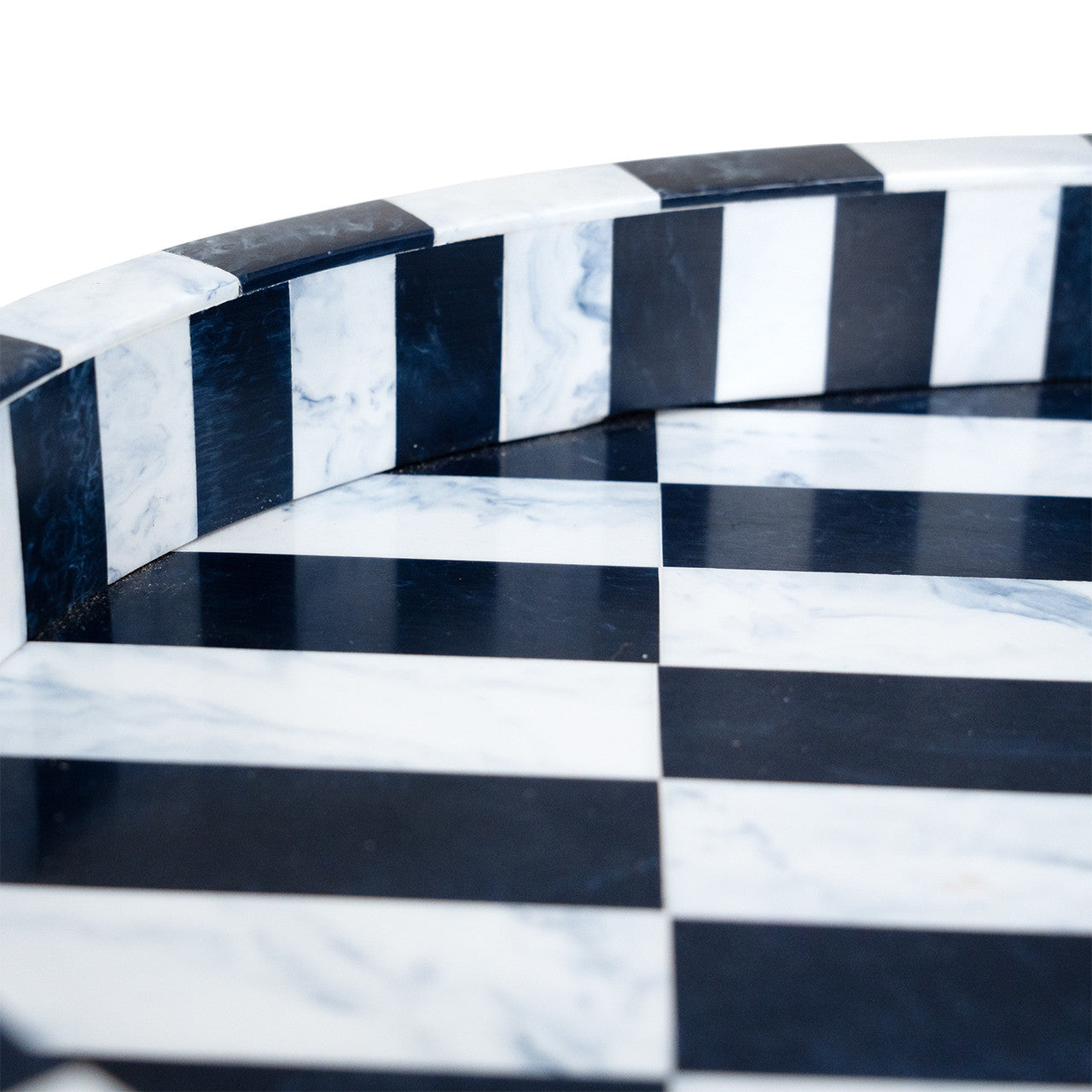 The Lunara Small Tray introduces refined coastal charm with its bold navy blue and white geometric pattern. This oval decorative accent piece, measuring 12 inches long by 9 inches wide with a 1.5-inch height profile, seamlessly integrates into coastal and modern beach house decor schemes. Crafted from durable resin materials.
