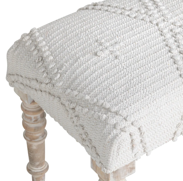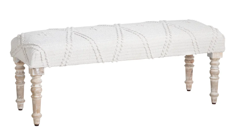 For a comfortable seat with organic appeal, look no further than the South Wales Bench by Crestview Collection. Crafted with spindle-style, natural mango wood legs, the brown tones of the wood shine through a subtle whitewash finish that adds a hint of weathered charm. Fixed upon the legs is a rectangular seat cushion upholstered with ivory cotton fabric that features a tufted, geometric pattern. As durable as it is decorative, this rustic-modern bench is expertly designed for dependability that is guaranteed to spark conversation for years to come.