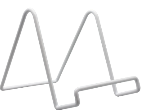 A white wire easel stand for displaying anything from an art canvas to a decorative plate.